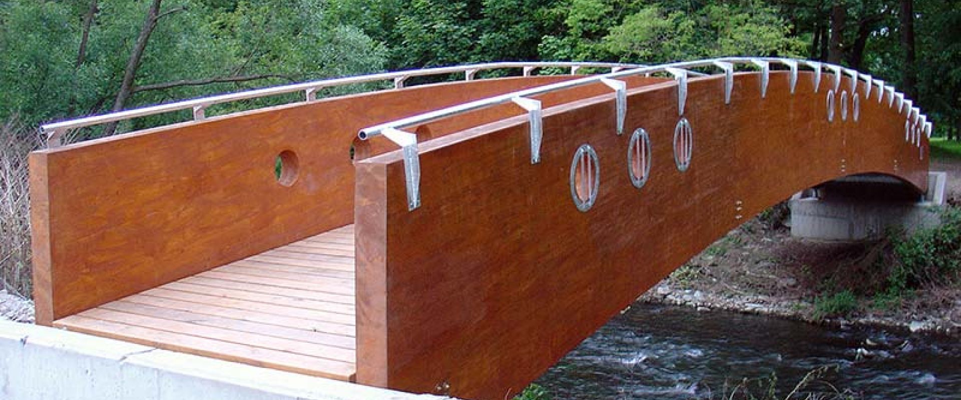 • lávka byla navržena s hlavními nosníky z lepeného dřeva, se spodní mostovkou tvořenou ocelovými příčníky, ztužením a dřevěnou podlážkou