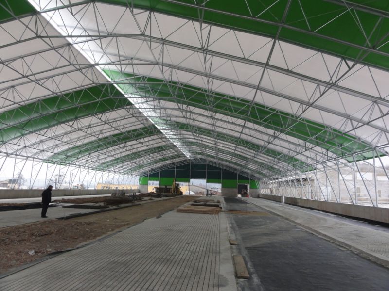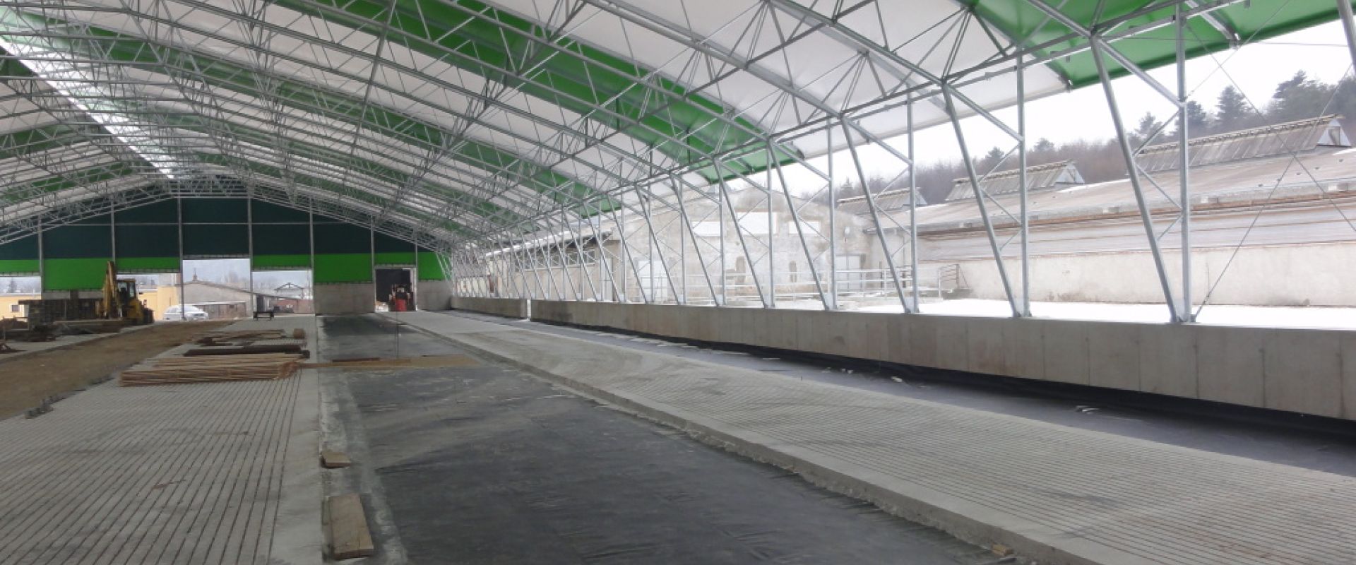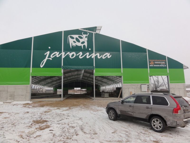 The subject of the realization was the design of the stall foundation which consists of foundation deck divided into dilatation units and system of retaining walls. Object of the dung-yard is composed of monolithic retaining walls connected with the floor deck. The whole building is divided into expansion units.