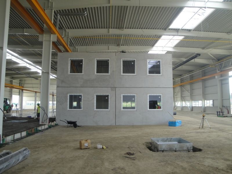 Foundation of the hall and administration building was designed using driven piles and the technology FRANKI, reinforced heads and strip foundation. Ceiling construction of the hall built-in objects was designed as reinforced concrete slab. The administration building was designed as a two-storey building dilated from the follow-up hall. Ceiling structures were designed as monolithic without beams.